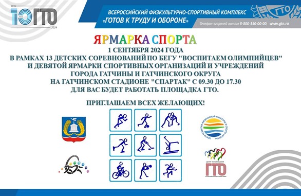1 сентября, в рамках 13 Детских соревнований по бегу "Воспитаем Олимпийцев" и ДЕВЯТОЙ ЯРМАРКИ СПОРТИВНЫХ ОРГАНИЗАЦИЙ И УЧРЕЖДЕНИЙ ГОРОДА ГАТЧИНЫ И ГАТЧИНСКОГО ОКРУГА